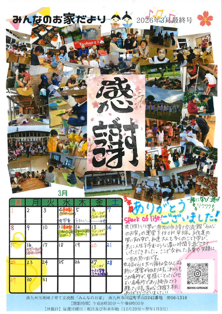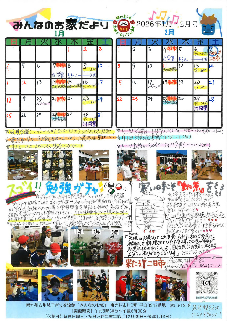 みんなのお家だよりの2026年1月・2月号及び3月号を掲載します。 地域子育て交流館「みんなのお家」で行っている事業が載っています。 事業やイベントの詳しい内容については,地域子育て交流館に直接お問い合わせいただくか公式インスタグラムで確認してください。 問い合わせ先:南九州市地域子育て交流館「みんなのお家」 ☎0993-56-1318 (日曜日・祝日・年末年始を除く8:30~18:00)
